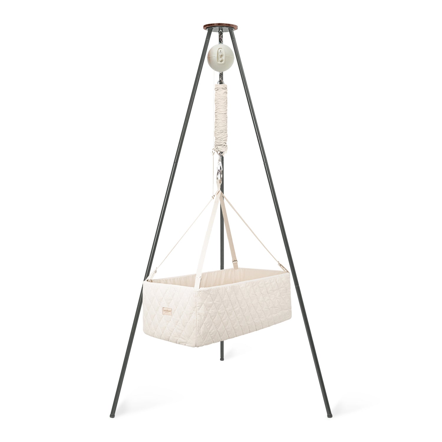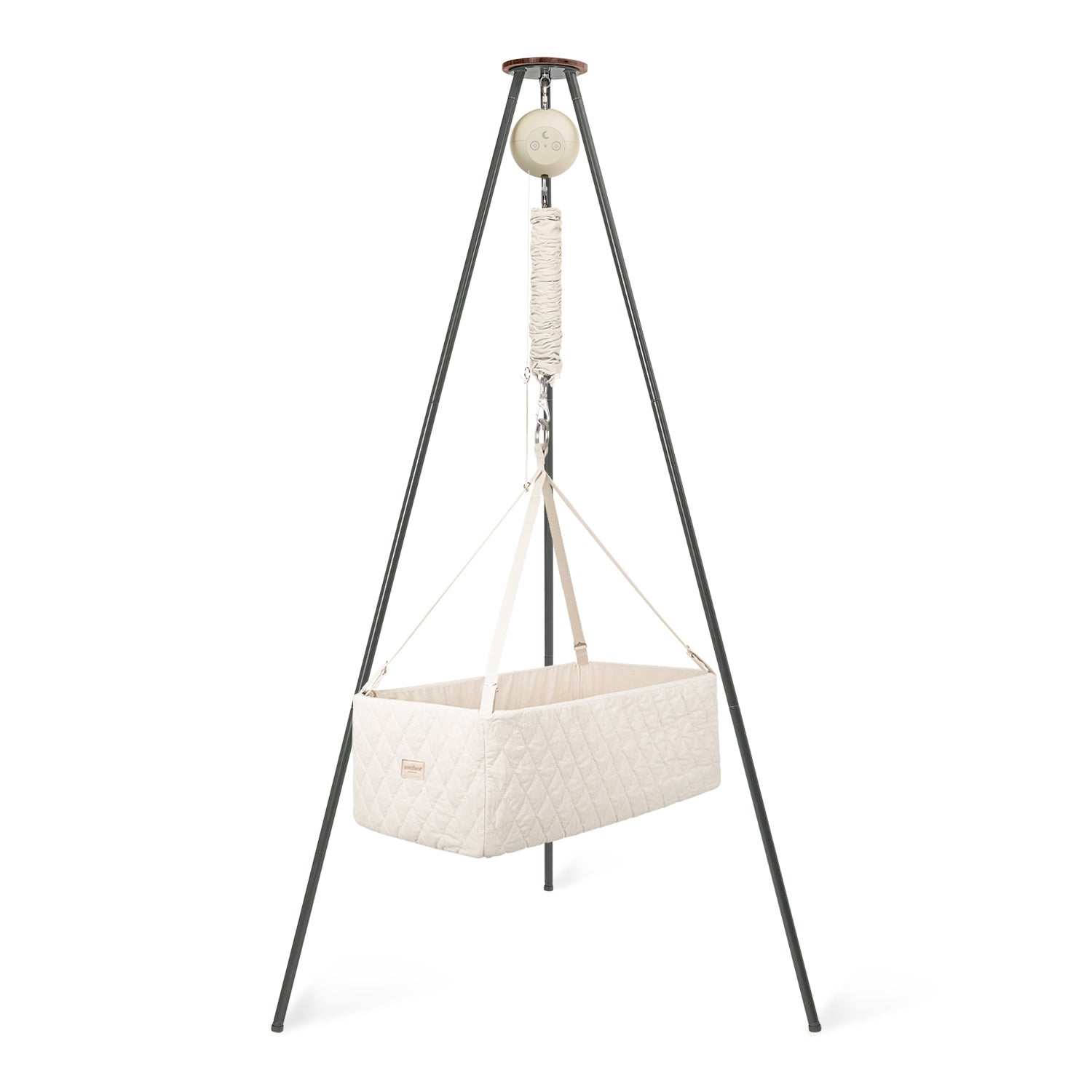 Met deze klassieke bundel ontvang je een ruime en GOTS-gecertificeerde wieg met vlakke bodem, de zacht wiegende bewegingen van onze wiegmotor en een praktische en stijlvolle statief standaard. Het is alles wat je nodig hebt om je baby meer en beter te laten slapen en om jou als ouder de kans te geven om uit te rusten en te herstellen.