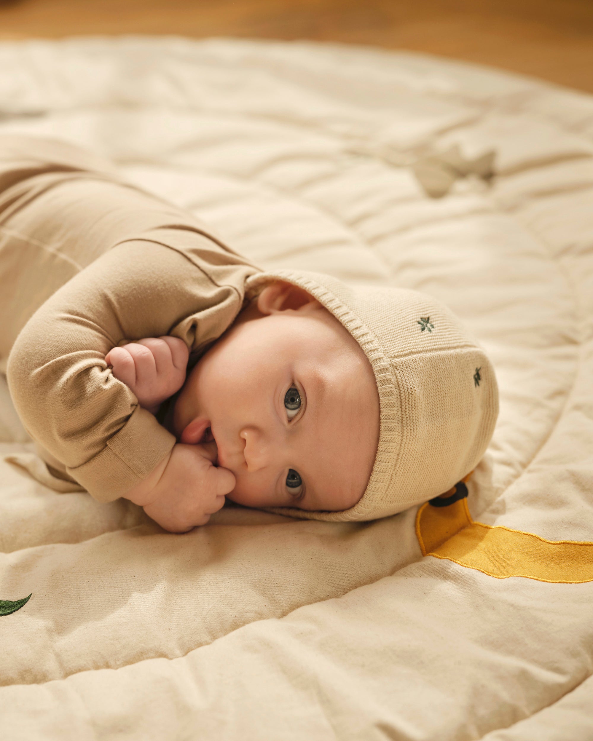 Gebreid mutsje met bijpassende slofjes, zorgvuldig vervaardigd van gecertificeerd biologisch katoen met delicate borduursels, zodat je baby er de hele dag lekker warm en comfortabel bij ligt. Een schattige outfit voor de eerste dag thuis of een attent cadeau voor het hele jaar door.