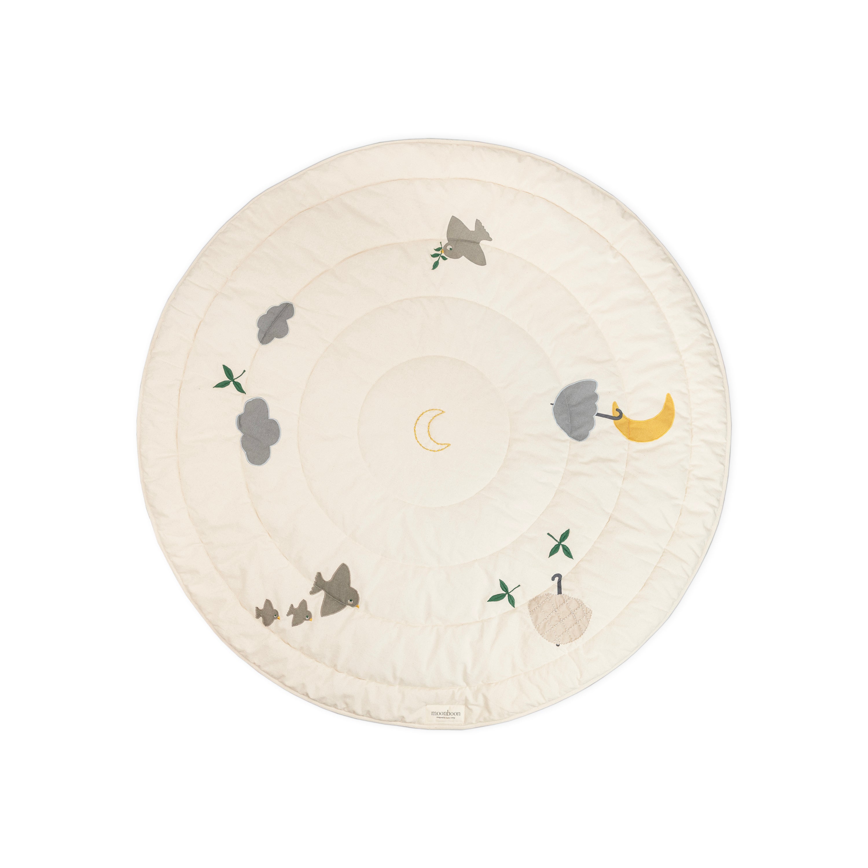 Elk stuk in de collectie, met een van de drie prints - leaf, over the moon nature of over the moon rose - of een van de magische karakters - maan, wolk, paraplu of vogel - bevat een gratis bedtijdverhaaltjesboek, Ole Lukøje, naverteld door Moonboon in samenwerking met het huis van H.C. Andersen.