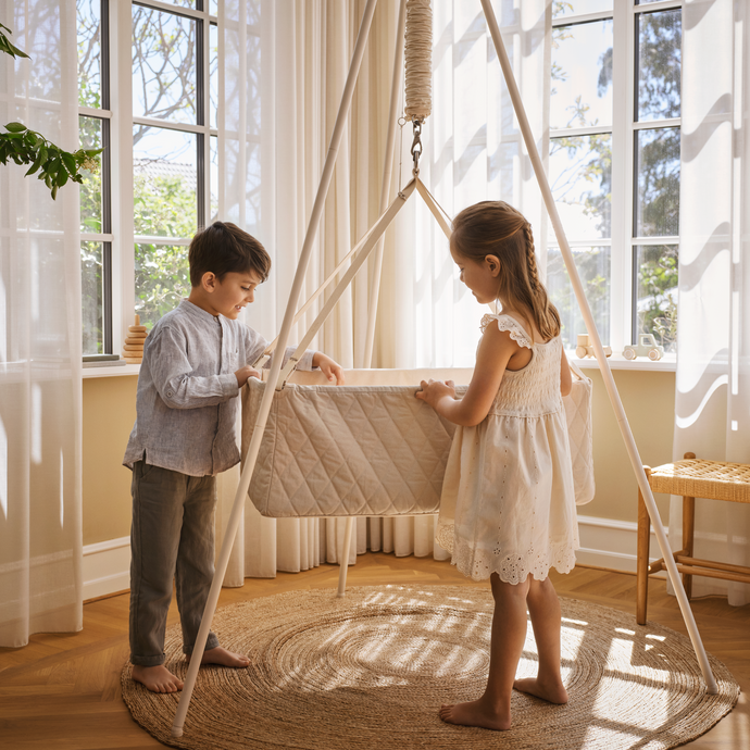 - Koop geen ophanghaken of metalen kettingen in de bouwmarkt. Er zijn helaas gevallen bekend waarbij baby's metaalsplinters in hun ogen hebben gekregen, maar nooit van een Moonboon product.