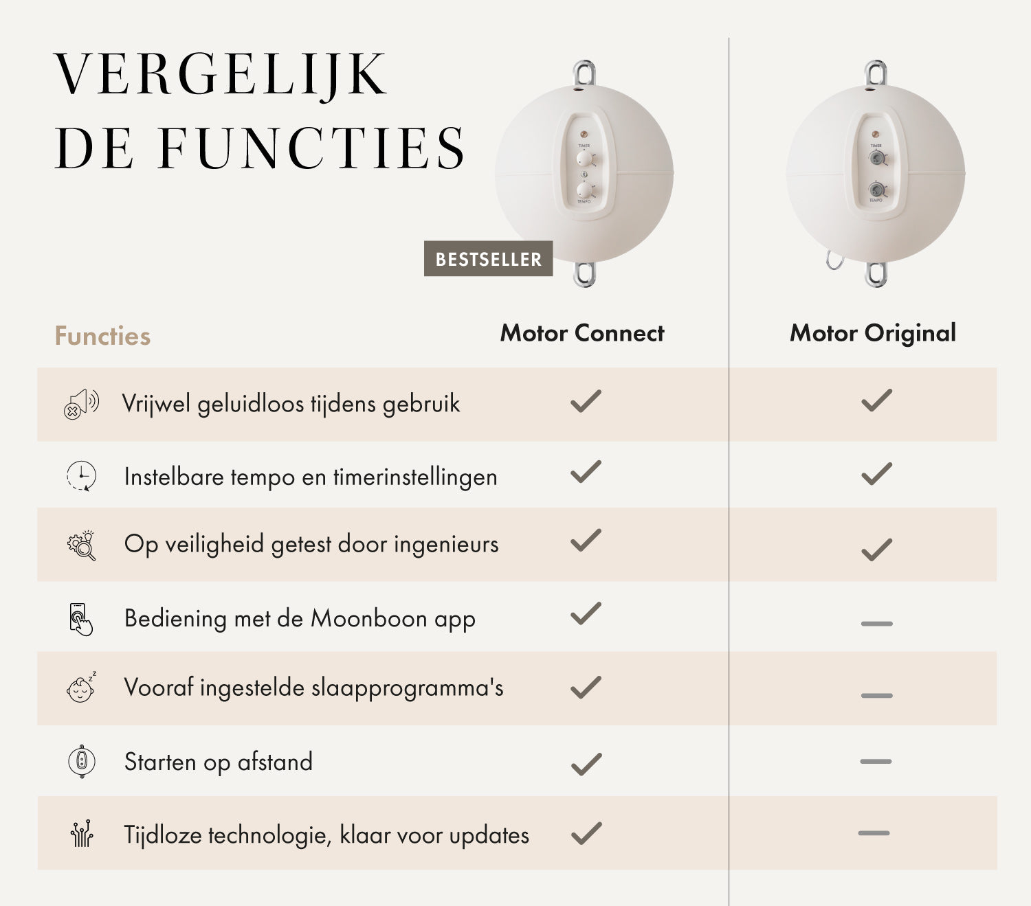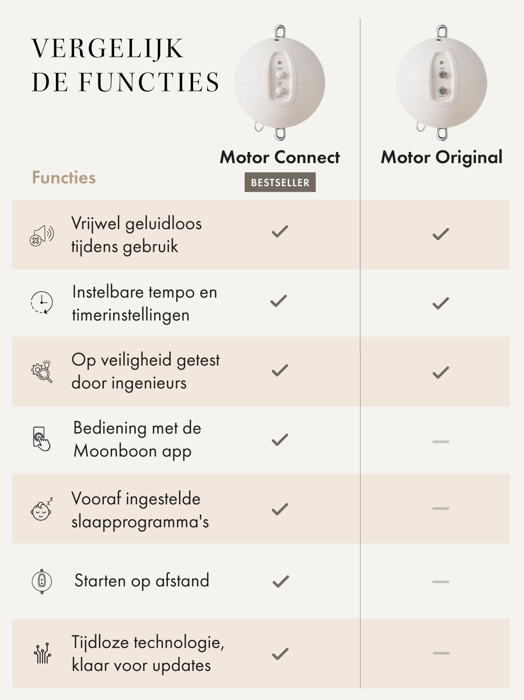 3. Langzaam beginnen: Het schommelen moet voorzichtig en langzaam worden ingezet - handmatig of met onze Moonboon Motor. Je kunt het tempo en de duur van het wiegen geleidelijk opvoeren naarmate je baby eraan gewend raakt. Je zult al snel leren wat voor jou werkt.